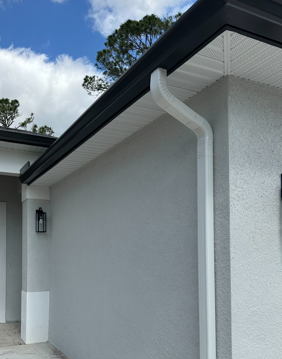 Strategically positioned downspouts are installed to guide water away from your foundation, preventing erosion and water damage—essential for maintaining your home’s stability in North Port’s sandy soil.
